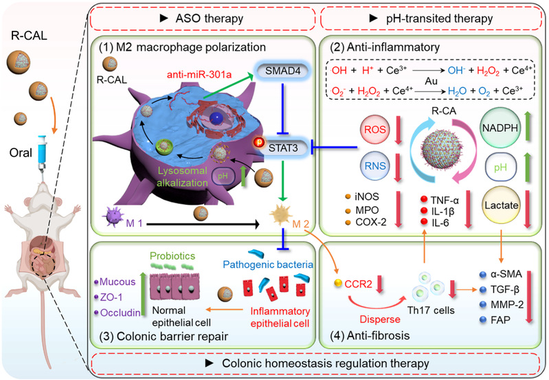 图1口服金缀合的铈基纳米递药平台装载anti-miR-301a治疗炎症性肠病的机制示意图