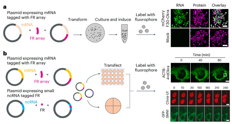 本研究系统总结了Pepper、Clivia和Okra三类荧光RNA的光物理与化学特性,并在此基础上构建了一套完整的活细胞RNA标记与动态成像技术体系。该体系涵盖多种关键应用场景,包括利用荧光RNA对细菌mRNA、哺乳动物细胞中小非编码RNA及mRNA进行原位、实时标记与高时空分辨率成像;基于生物正交荧光RNA,实现同一细胞内多种RNA分子的多重、多色标记与成像;结合流式细胞术,建立单细胞水平RNA丰度的高通量定量分析方法,并详述其实验流程要点。此外,研究团队针对技术实施中的核心环节,包括融合RNA的设计与构建策略、RNA表达与标记浓度优化、活细胞成像条件设定等,提供了系统性操作指南,并就常见技术难点提出了针对性解决方案与验证建议。该技术体系不仅显著提升了荧光RNA工具在活细胞RNA空间分布、转运、代谢及功能解析中的实用性与可靠性,也为深入探究RNA在生理与病理过程中的调控机制提供了有力的方法学支撑和重要参考。
